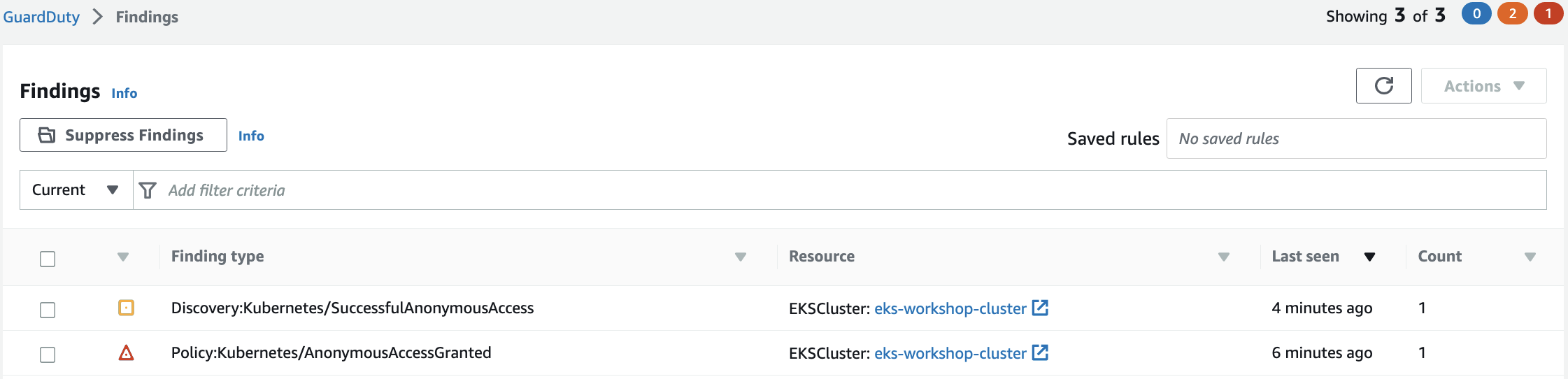 Note that the above rolebinding command will trigger Policy:Kubernetes/AnonymousAccessGranted finding in guard duty within few minutes.